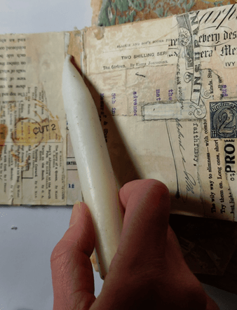 When the pages are completely dry, I gently rub over them with a candle – I use an ordinary household candle for this. This step is to ensure that the pages won’t stick together when the book is displayed, which can be an issue in a humid environment.