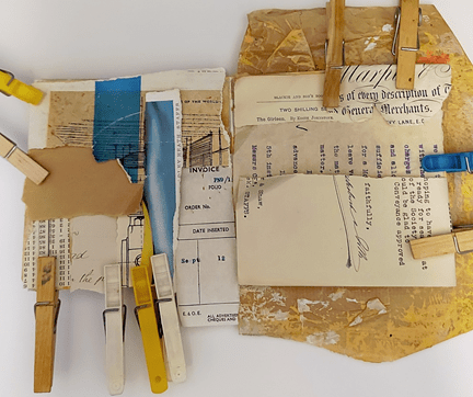 Once all the pages have been gessoed once and painted twice, it’s time for the fun bit of choosing the collage elements. As I plan each layout, I use ordinary clothes pegs to hold the papers in place to get a reasonable idea of how the end result will look. I then take a few quick photographs to use for reference when I begin gluing.
