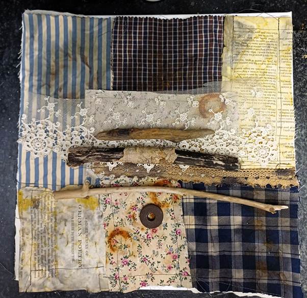 Work in progress (approx. 30cm square) featuring rust-dyed fabrics and papers